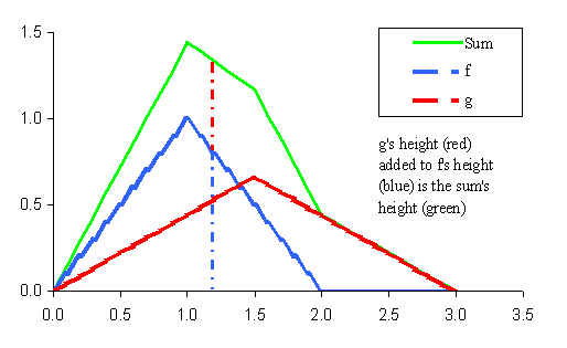 To generalize the histogram, we considered the process of adding areas. Consider two planar regions, each bounded by a curve on the top and the x-axis (points where y = 0) on the bottom. We name these curves f and g. The areas of these regions are Integral{ f(x)dx } and Integral{ g(x)dx }, respectively. The curve f+g is constructed by adding the heights at each point x; that is, (f+g)(x) is defined to be f(x) + g(x). Geometrically, we are just adding heights. From the linearityl equation
